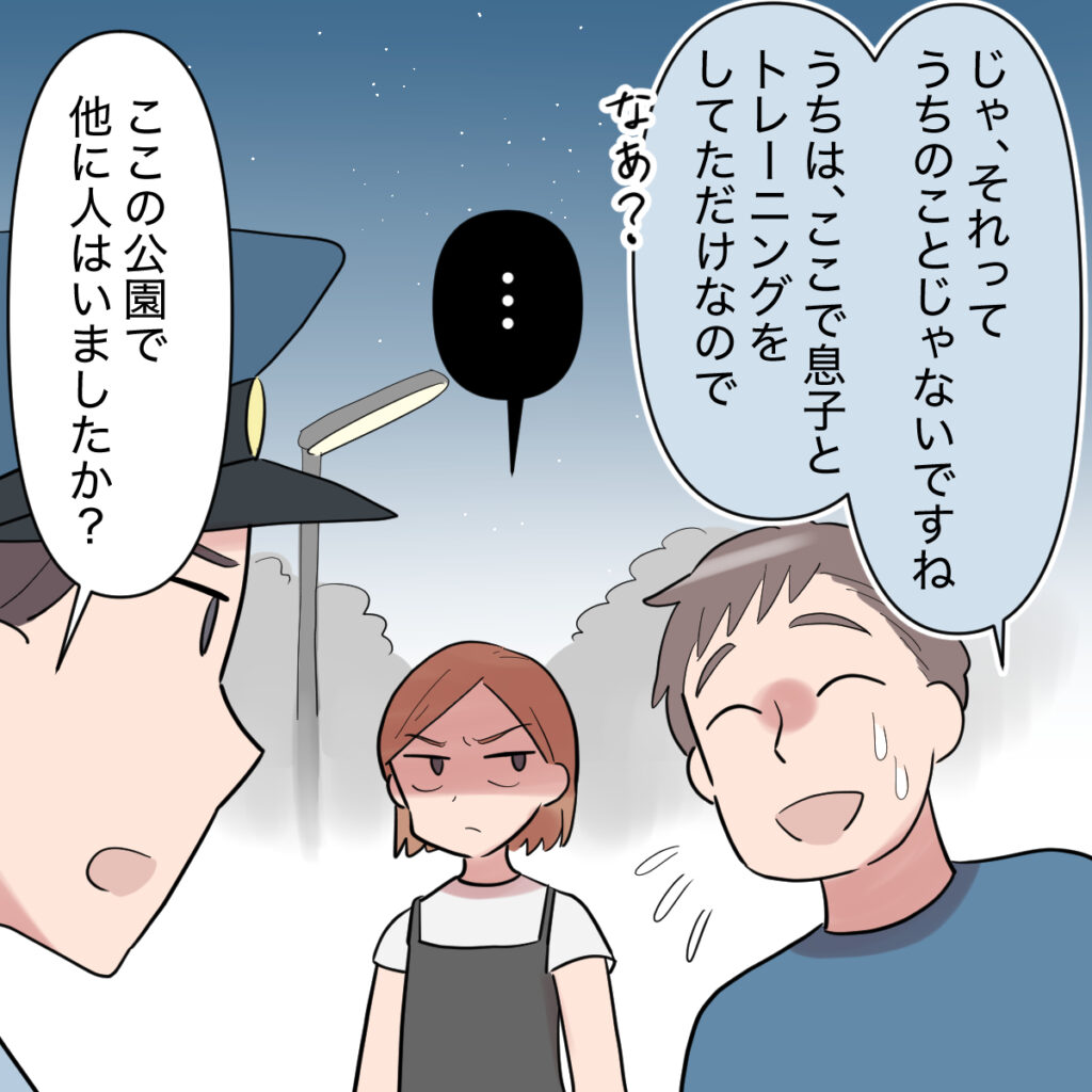 「男の人が」と聞いて明らかに焦った様子の夫。「じゃ、それってうちのことじゃないですね。うちは、ここで息子とトレーニングをしてただけなので。」と言い訳をして、「なぁ?」と私に同意を求めてきました。でも「この公園で他に人はいましたか?」と、警察官は冷静です。私はまだ黙って夫の様子を見つめていました。