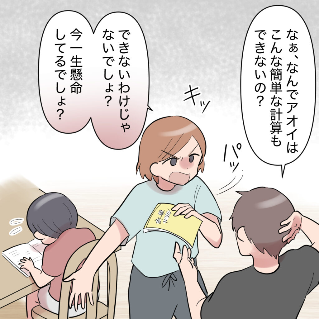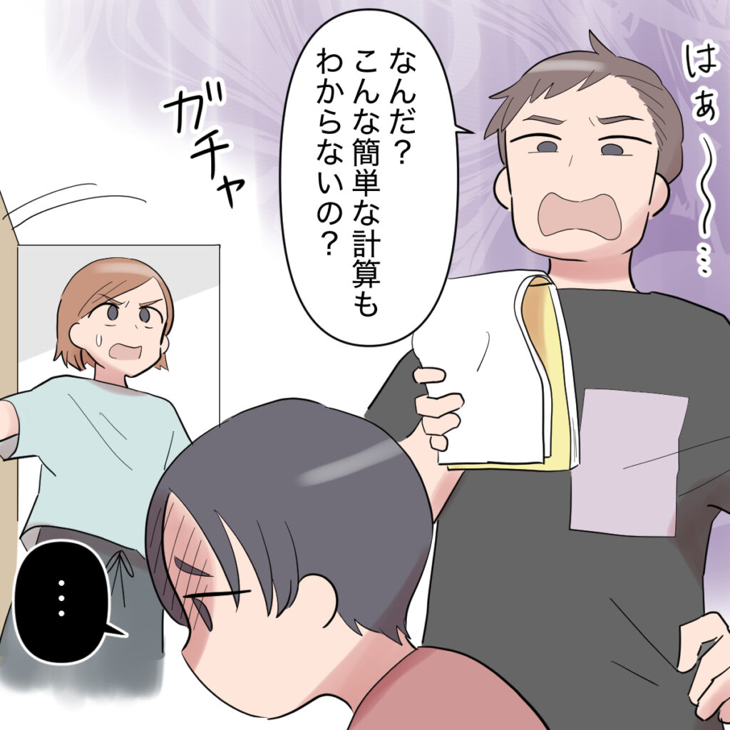 ダイニングのドアを開けると、宿題をするアオイの横で仁王立ちになった夫が「なんだ?こんな簡単な計算もわからないの?」と呆れたように言っていて、アオイは何も言い返せず俯いていました。