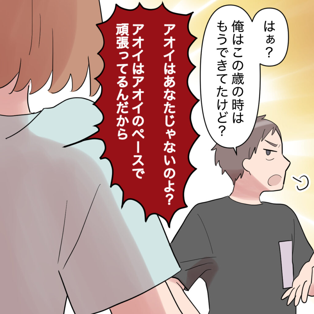 夫は「はぁ?俺はこの歳の時はもうできてたけど?」と自分と比べてアオイを馬鹿にしたように言いました。「アオイはあなたじゃないのよ?アオイはアオイのペースで頑張ってるんだから」私は思わず声を荒げました。