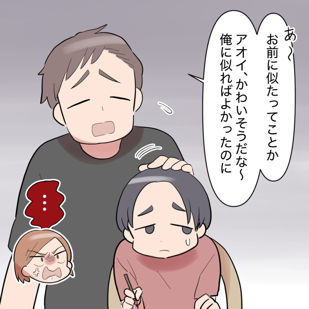 すると、夫は「あ~。お前に似たってことか。アオイ、かわいそうだな~。俺に似ればよかったのに」と私を貶めてアオイを憐れみはじめました。アオイは申し訳なさそうに俯いていました。