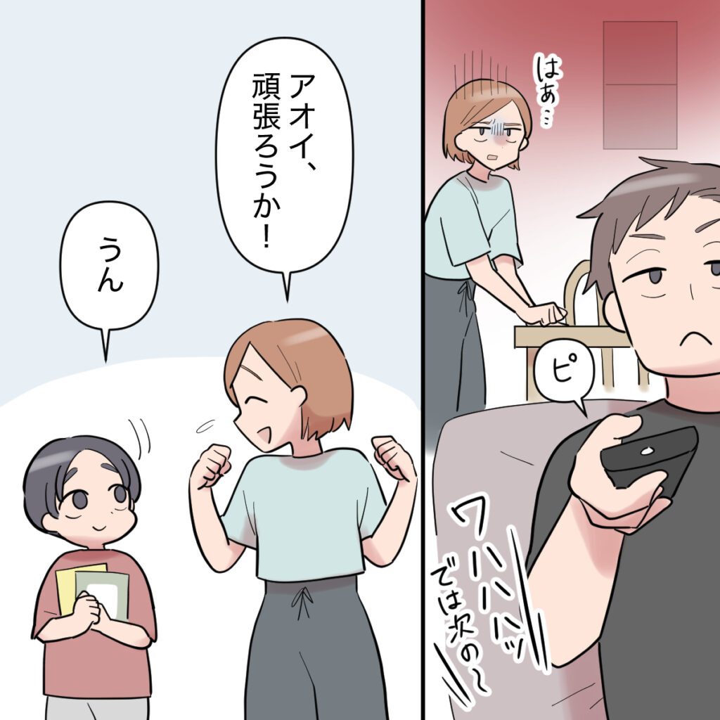 そしてまた、言いたい事を言った後は大きな音でテレビを見始めた夫に呆れつつ、「アオイ、頑張ろうか!」と声をかけると、「うん」と素直に返事をするアオイくんが、