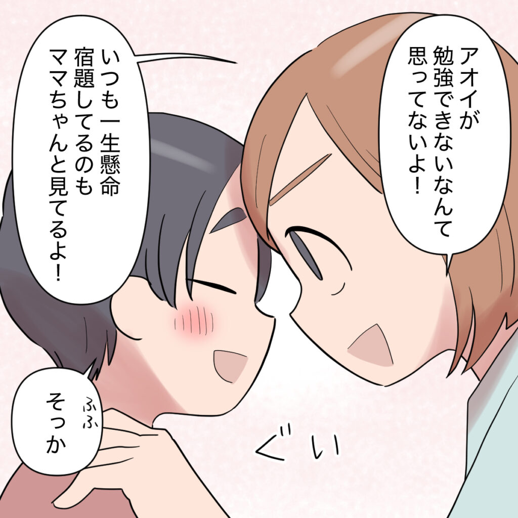 「アオイが勉強できないなんて思ってないよ!いつも一生懸命宿題してるのも、ママちゃんと見てるよ!」そう伝えると、「ふふ・・そっか」と嬉しそうなアオイ。