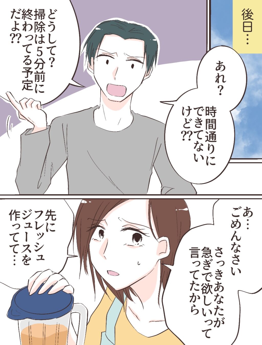 「あれ?時間通りにできてないけど??どうして?掃除は5分前に終わってる予定だよ??」怒りながら言うリヒトさんに、「あ・・ごめんなさい。さっきあなたが急ぎで欲しいって言ってたから、先にフレッシュジュースを作ってて・・」と言うと、