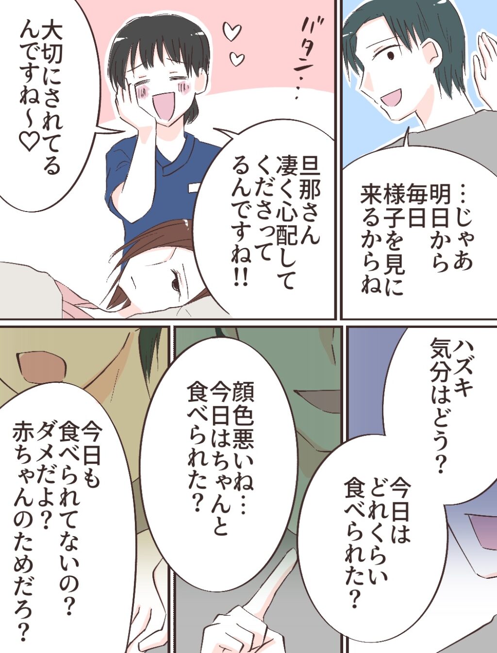 そして、「ハズキ気分はどう?今日はどれくらい食べられた?」またある日は「顔色悪いね・・今日はちゃんと食べられた?」そしてまた次の日は「今日も食べられてないの?ダメだよ?赤ちゃんのためだろ?」とリヒトさんは毎日何かしら言って帰りました。
