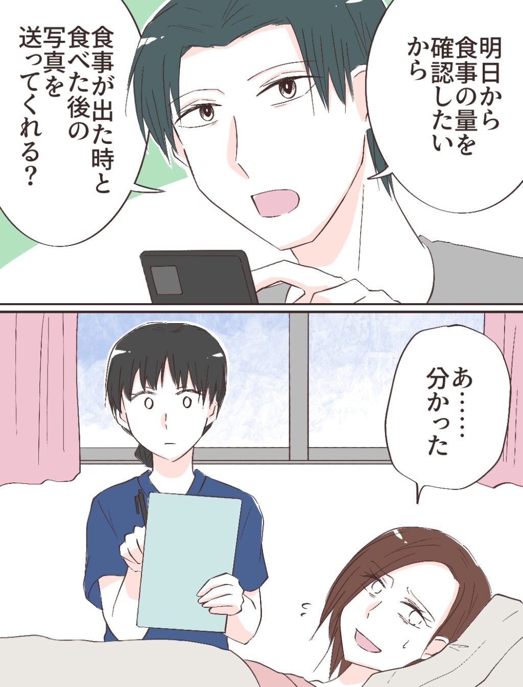さらに、「明日から食事の量を確認したいから、食事が出た時と食べた後の写真を送ってくれる?」リヒトさんの言葉に驚く看護師さん。ハズキさんが「あ・・分かった」と答えるのを見て、