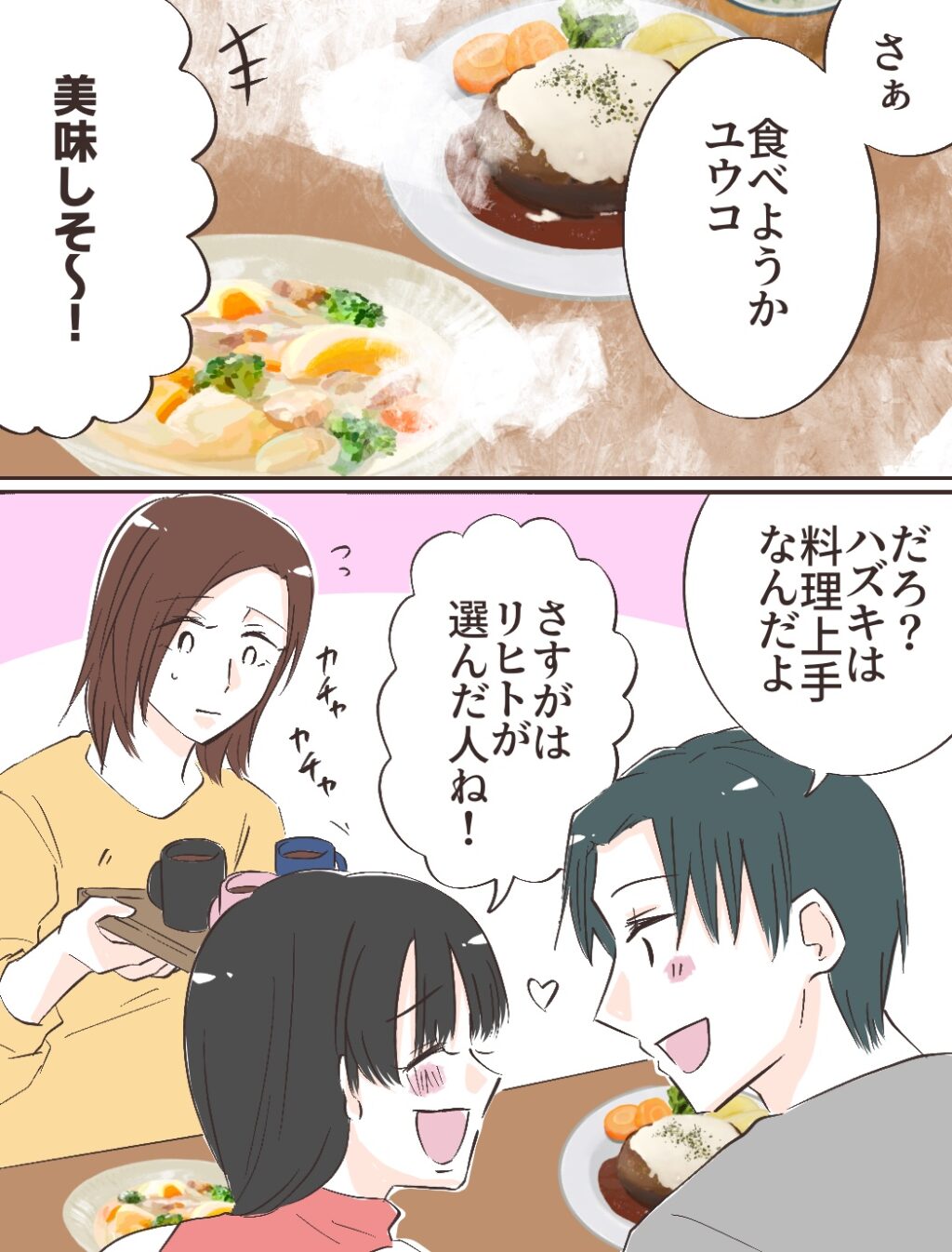 私が作った料理をリヒトさんとユウコさんが並んで食べます。「さあ食べようかユウコ」って。