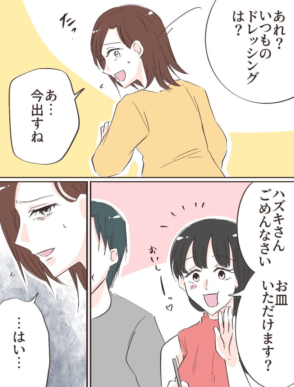 「あれ?いつものドレッシングは?」リヒトさんのひと言に反射的に立ち上がる私。完璧に用意しなくちゃ。そればかりが頭にありました。「ハズキさんごめんなさい、お皿いただけます?」とユウコさんが食べながら言いました。「・・・はい・・・」すごく惨めな気分。