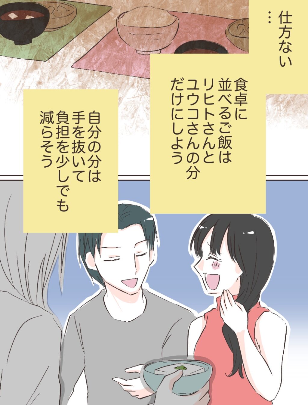 仕方ない。食卓に並べるご飯はリヒトさんとユウコさんの分だけにしよう。自分の分は手を抜いて負担を少しでも減らそう。とにかくちゃんとできるところをリヒトさんに見せて、リヒトさんに認めてもらわなくちゃ。そればかり考えていました。