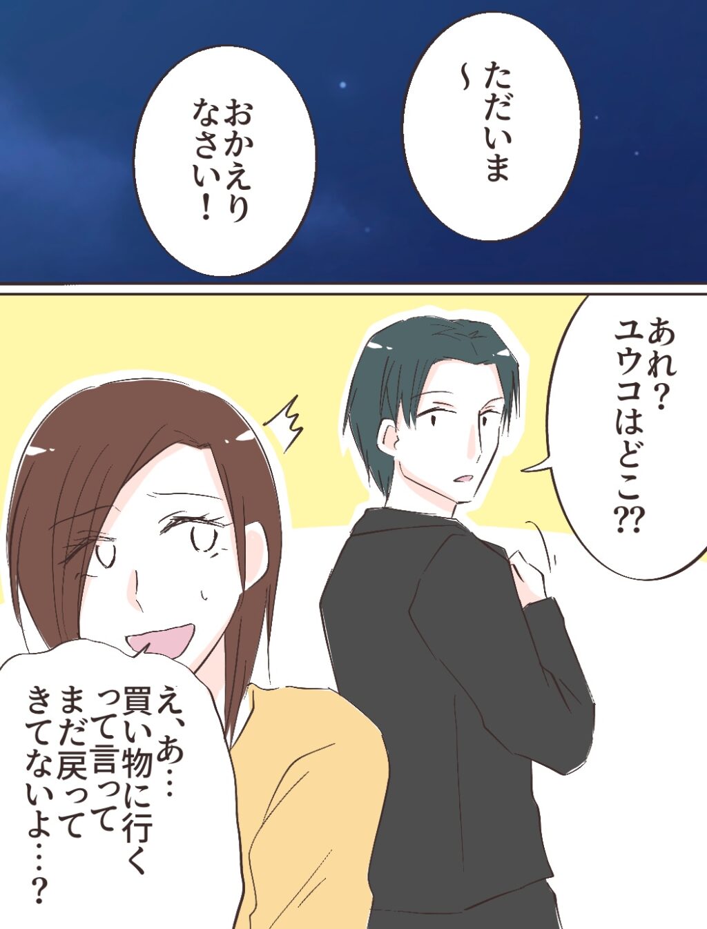 「ただいま~」「おかえりなさい!」帰って来たリヒトさんに、「あれ?ユウコはどこ??」とたずねられ、「え、あ・・買い物に行くって言ってまだ戻ってきてないよ・・?」と答えると、