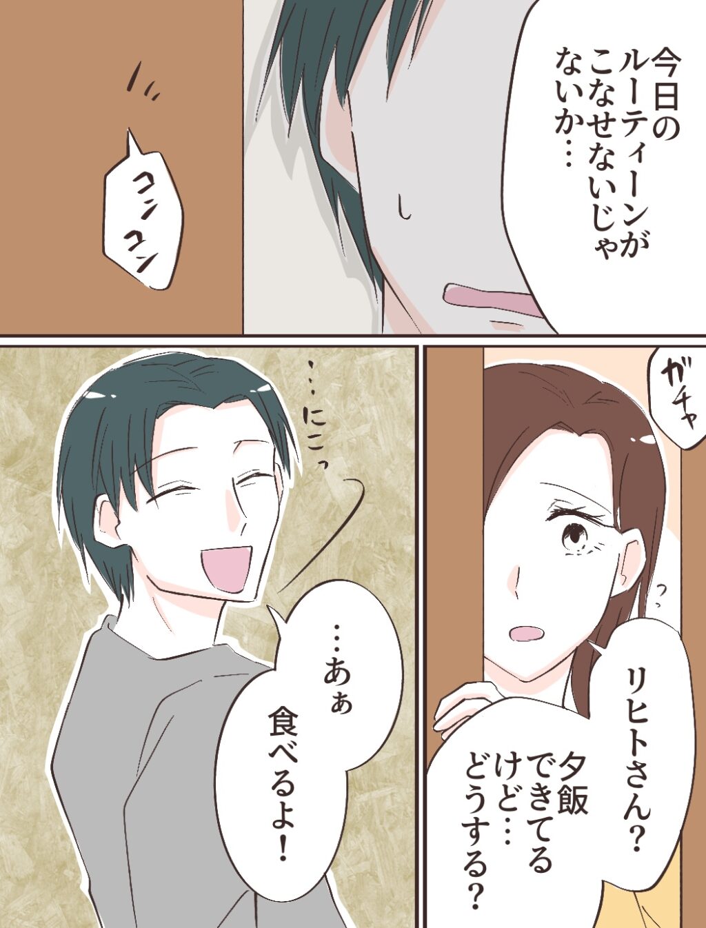「今日のルーティンがこなせないじゃないか・・」と呟くリヒトさんの部屋を訪ね、「リヒトさん?夕飯できてるけど・・どうする?」と聞くと、にこっと笑って、「・・あぁ、食べるよ!」と笑顔で言いました。