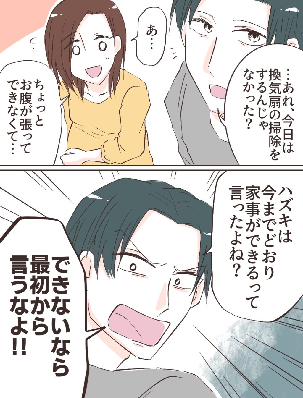 そして、「・・あれ、今日は換気扇の掃除をするんじゃなかった?」リヒトさんにそう言われ、「あ・・ちょっとお腹が張ってできなくて・・」と答えると、「ハズキは今までどおり家事ができるって言ったよね?できないなら最初から言うなよ!!」と怖い顔で怒鳴るリヒトさん。