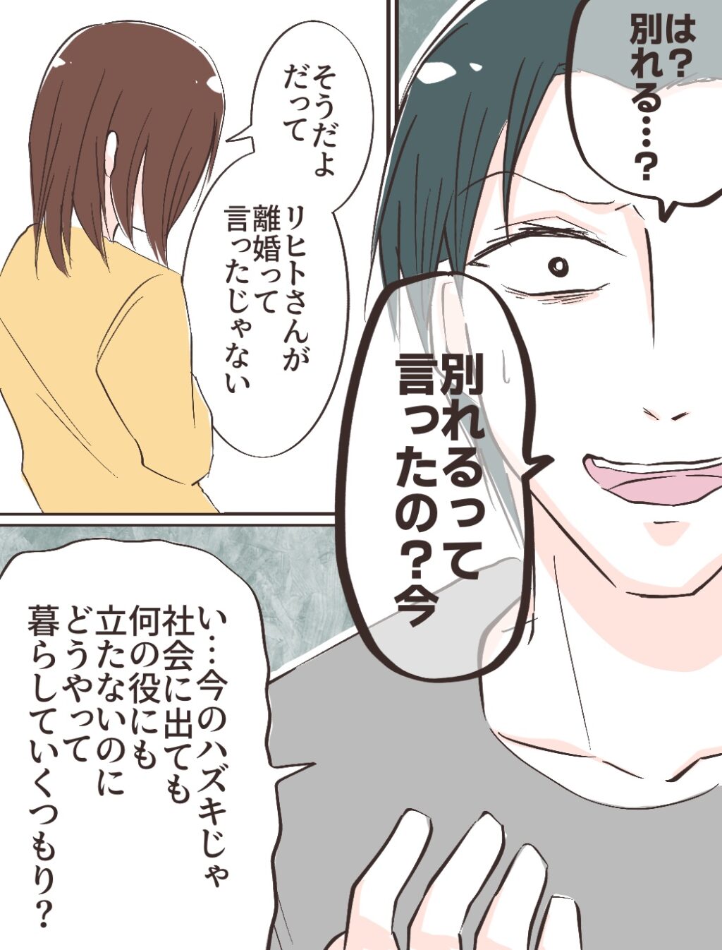 リヒトさんは「は?別れる・・?別れるって言ったの?今」と顔を歪ませました。「そうだよ。だって、リヒトさんが離婚って言ったじゃない」と返すと、「い・・今のハズキじゃ社会に出ても何の役にも立たないのにどうやって暮らしていくつもり?」と言いました。