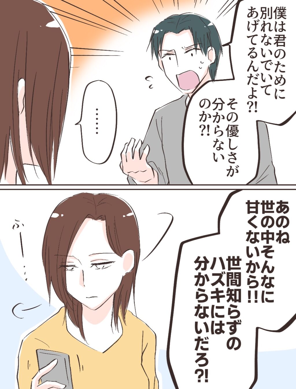 リヒトさんが「僕は君のために別れないでいてあげてるんだよ?!その優しさが分からないのか?!」と恩着せがましく言うので黙っていると、さらに「あのね、世の中そんなに甘くないから!!世間知らずのハズキには分からないだろ?!」と今度は不安を煽ったり、離婚を回避しようと必死にあれこれ言ってきました。私は冷めた気持ちで溜息をつきながらスマホを取りだしました。