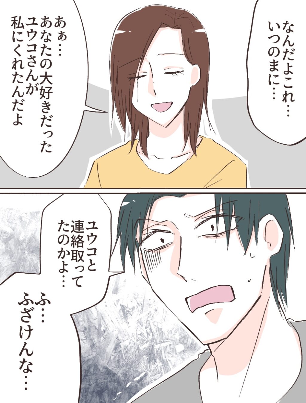 「なんだよこれ・・いつのまに・・」そう呟くリヒトさんに、私は「あぁ・・あなたの大好きだったユウコさんが私にくれたんだよ」とさらり。「ユウコと連絡取ってたのかよ・・。ふ・・ふざけんな・・」青ざめていたリヒトさんの顔に怒りが満ちていきました。