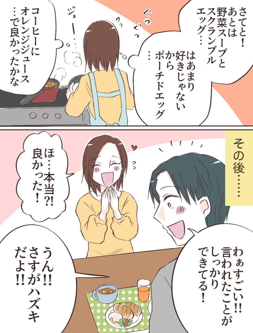 リヒトさんが家を出てからは時間との戦いです。「さてと!あとは野菜スープとスクランブルエッグ・・はあまり好きじゃないからポーチドエッグ・・。コーヒーにオレンジジュース・・で良かったかな」と一人でブツブツ言いながら急いで朝食準備。ジョギングから帰ってきたリヒトさんはテーブルの朝食を見ると「わぁすごい!!言われたことがしっかりできてる!」と喜んでくれました。「ほ・・本当?!良かった!」とホッとする私をリヒトさんは「うん!!さすがハズキだよ!!」と褒めてくれました。