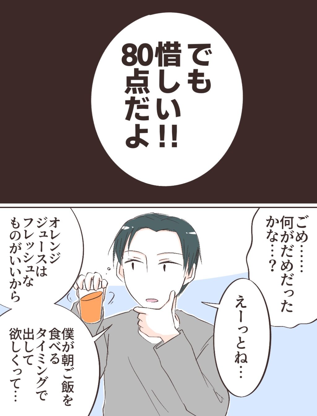 しかし・・リヒトさんの期待に応えられたとホッとしたのも束の間、「でも惜しい!!80点だよ」と言われてしまいました。「ごめ・・何がだめだったかな・・?」と恐る恐る聞くと、「えーっとね・・オレンジジュースはフレッシュなものがいいから、僕が朝ごはんを食べるタイミングで出して欲しくって・・」とリヒトさんのダメ出しが始まりました。