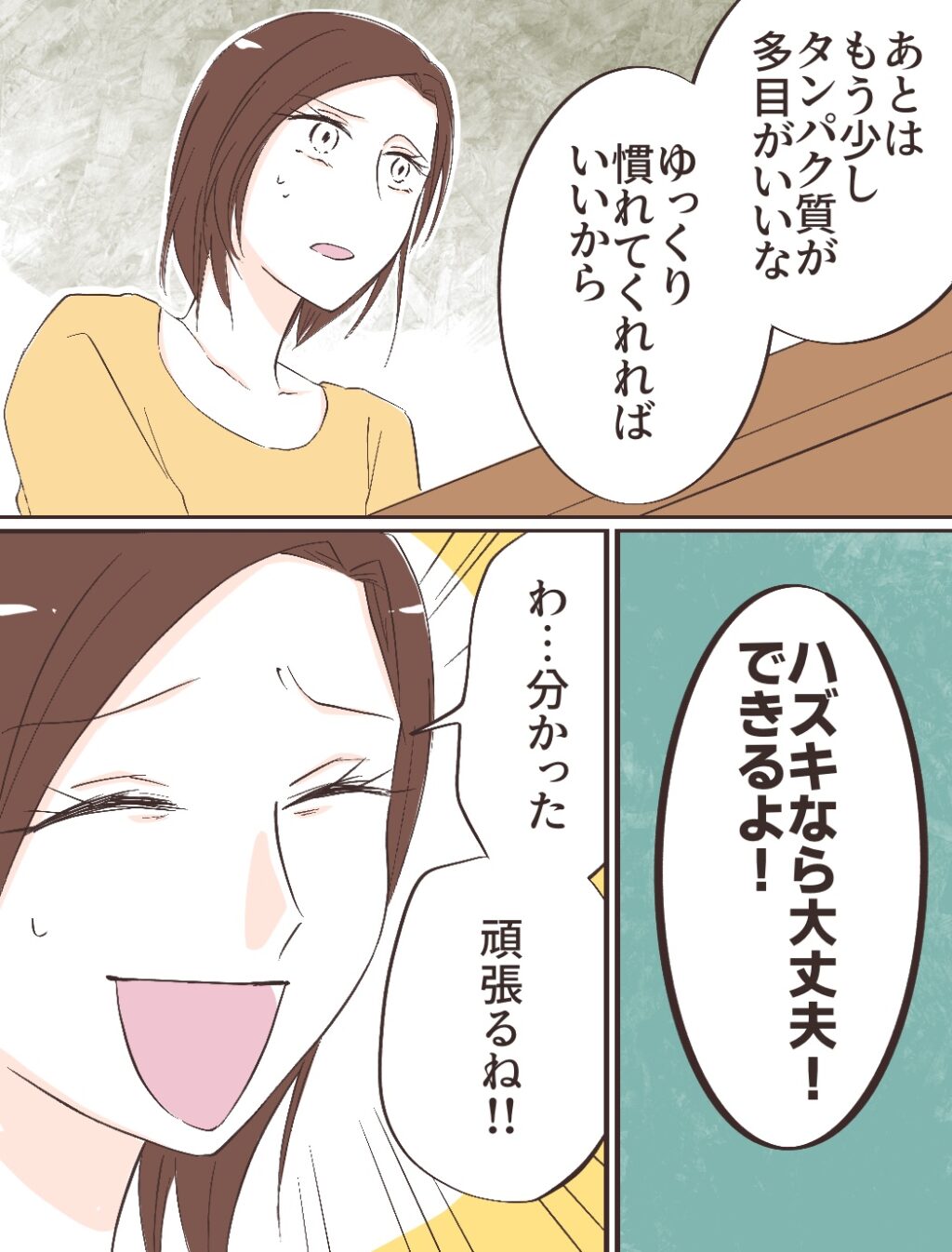 「あとはもう少したんぱく質が多めがいいな」次々と出てくるリヒトさんのリクエスト。「ゆっくり慣れてくれればいいから。ハズキなら大丈夫!できるよ!」と笑顔で言われ、私はショックを受けつつも「わ・・分かった。頑張るね!!」と明るく答えました。