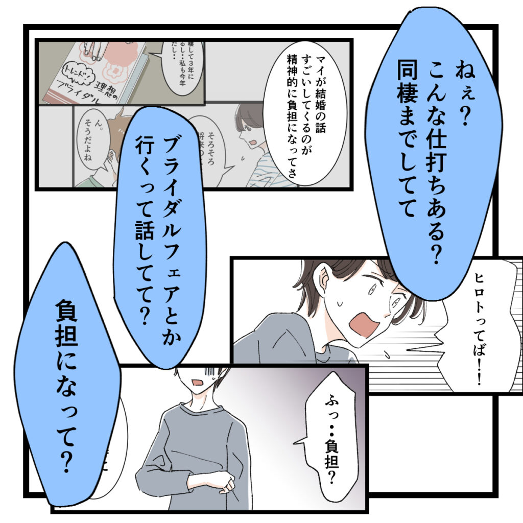 同僚のハルカにヒロトに捨てられたことを一気に吐き出した私は、ヒロトへの文句が止まらなくなりました。「ねぇ?こんな仕打ちある?同棲までしてて、ブライダルフェアとか行くって話してて?負担になって?」