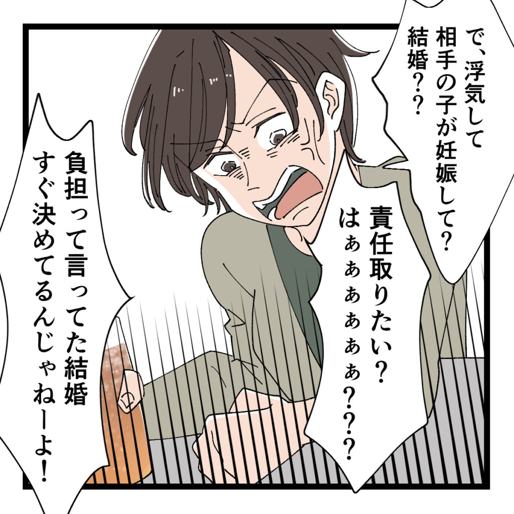 「で、浮気して相手の子が妊娠して?結婚??責任取りたい?はあぁぁぁぁぁぁ???負担って言ってた結婚すぐ決めてるんじゃねーよ!」
