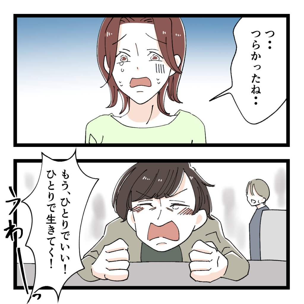 「つ・・つらかったね・・」そう言ってハルカは私のために泣いてくれました。ハルカに優しくされ涙が止まらなくなった私は、周りの目を気にせず「もう、ひとりでいい!ひとりで生きてく!」と大声で泣きました。