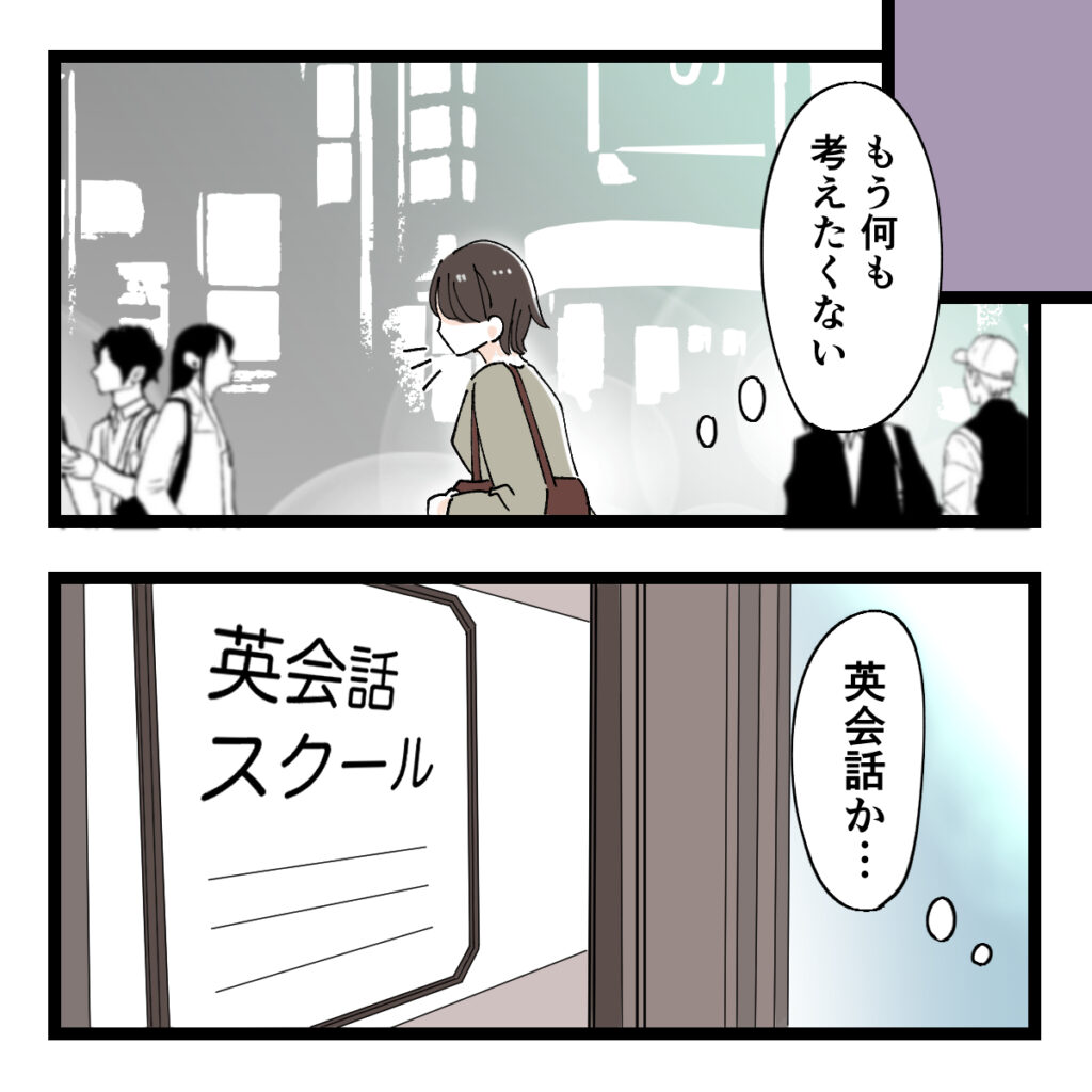 ハルカに話しを聞いてもらい思いきり泣いた私。帰り道、「もう何も考えたくない」と思いながら一人で歩いていると、ふと英会話スクールの看板が目に入りました。「英会話か・・」今までは全く興味のなかった英会話ですが、このときなぜか無性に気になりました。