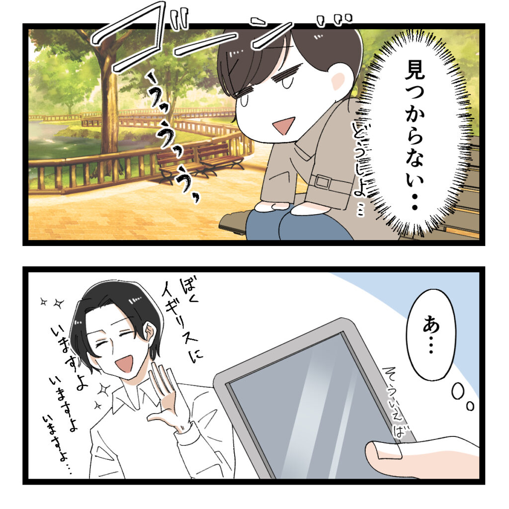 その後、「見つからない・・どうしよう・・」と公園のベンチで落ち込んでいたところ、「あ・・」と英会話スクールのイケメンがイギリスに行くと言っていたのを思い出しました。