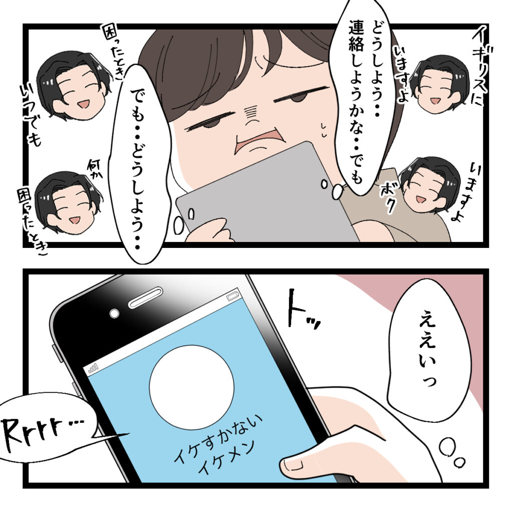 「どうしよう・・連絡しようかな・・でも・・でも・・どうしよう・・」頭の中では「イギリスにいますよ」とイケメンが囁きます。結局、「ええいっ!」とイケメンに電話してみることに。