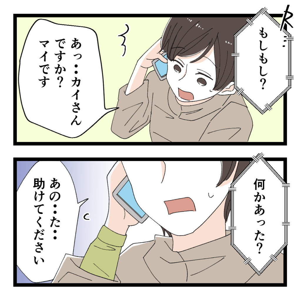 プルルルル「もしもし?」と声が聞こえ、「あっ・・カイさんですか?マイです」と言うと、「何かあった?」とたずねられ、「あの・・た・・助けてください」と懇願したのでした。
