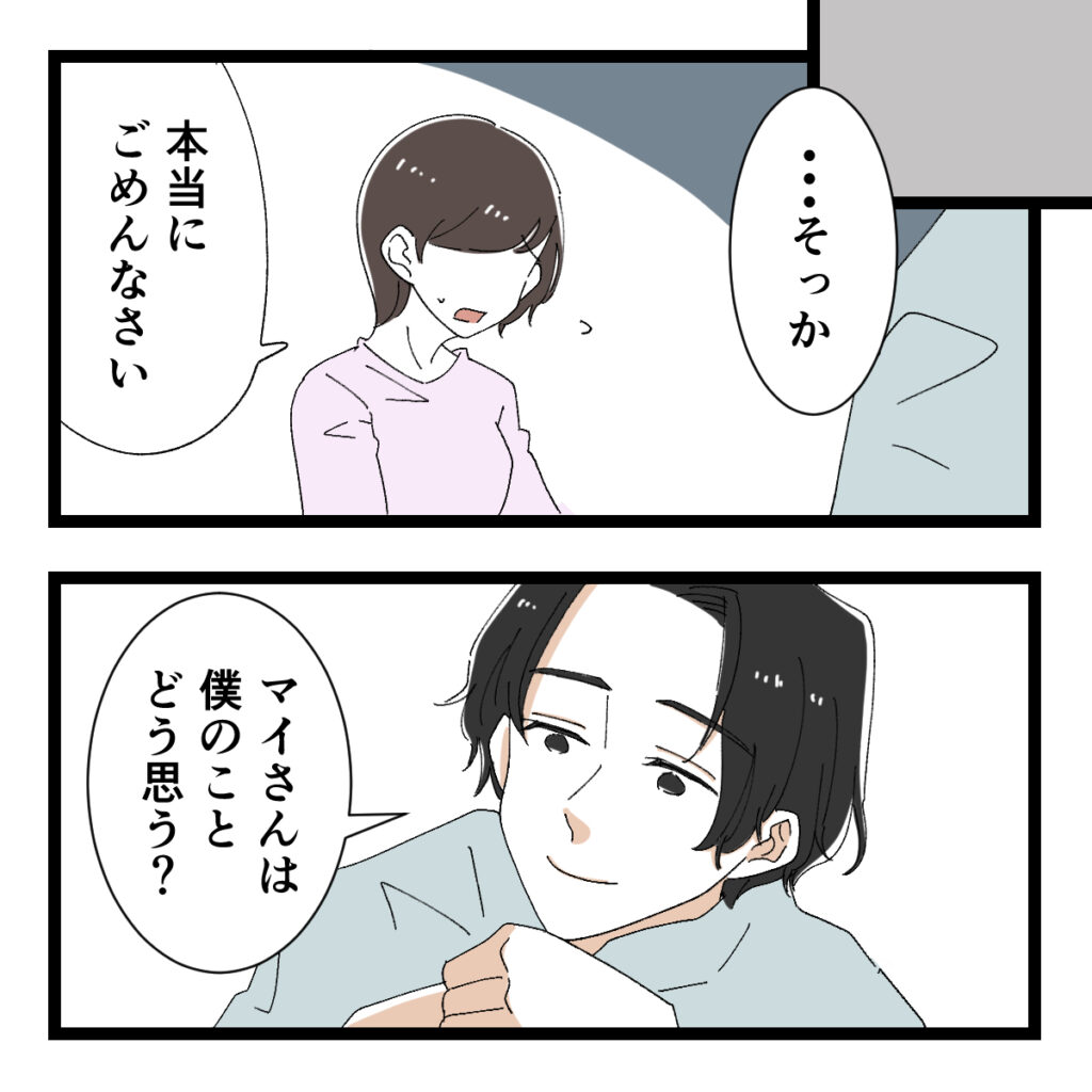 イギリスで助けてもらったお礼にカイさんと食事に行くと、突然「結婚を前提に付き合ってくれない?」と言われビックリ。「そういうの考えてない?」と聞かれた私はヒロトのことが頭をよぎり、カイさんに話すことにしました。ヒロトとのことがあり結婚に前向きになれないことを打ち明けると、カイさんは「・・そっか」と静かに一言。「本当にごめんなさい」と謝ると、「マイさんは僕のことどう思う?」と聞いてきました。