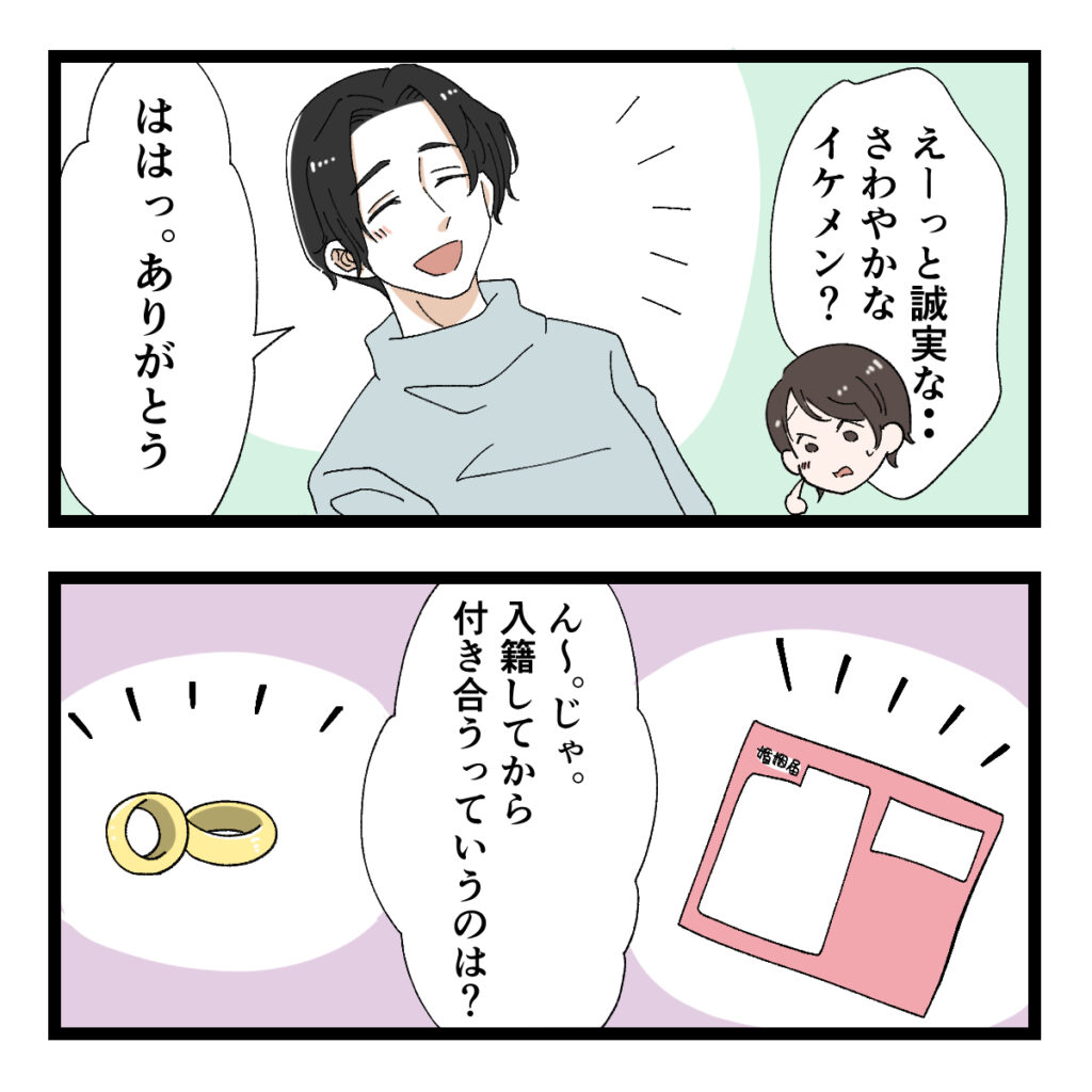 私は「えーっと誠実な・・さわやかなイケメン?」と正直に答えると、カイさんは「ははっ。ありがとう」と笑い「ん~。じゃ、入籍してから付き合うっていうのは?」とまた驚きの提案。
