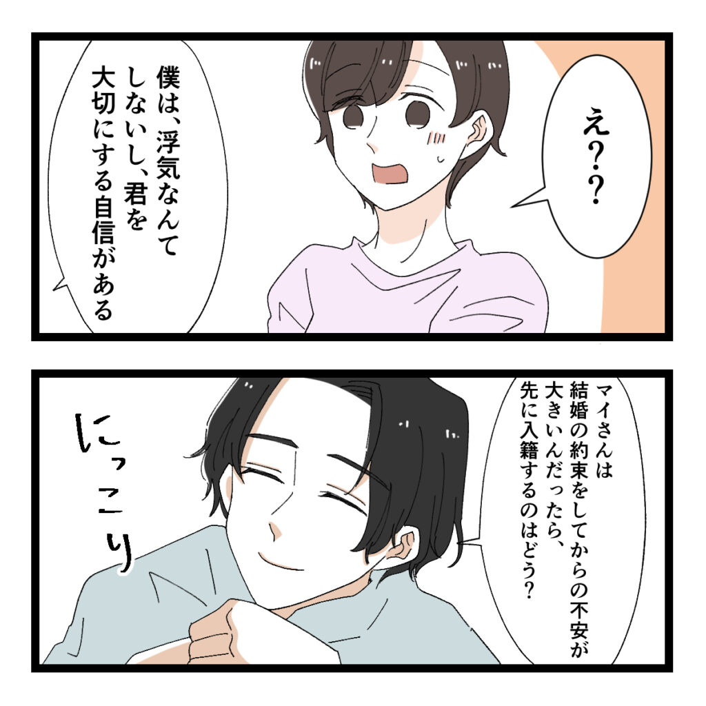 「え??」と戸惑う私に、「僕は、浮気なんてしないし、君を大切にする自信がある」と力強く断言し、「マイさんは結婚の約束をしてからの不安が大きいんだったら、先に入籍するのはどう?」とにっこり笑顔を向けてくるカイさん。