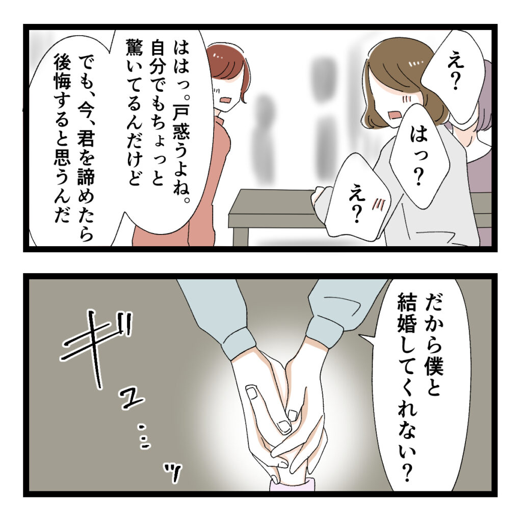 カイさんの猛アプローチに、私は「え?」「はっ?」「え?」とたじたじに。周りの席の女性たちもカイさんのほうをチラチラ見ています。そんな視線などお構いなしに、カイさんは「ははっ。戸惑うよね。自分でもちょっと驚いてるんだけど。でも、今、君を諦めたら後悔すると思うんだ」と言い、私の手をギュッと握って「だから僕と結婚してくれない?」と言いました。
