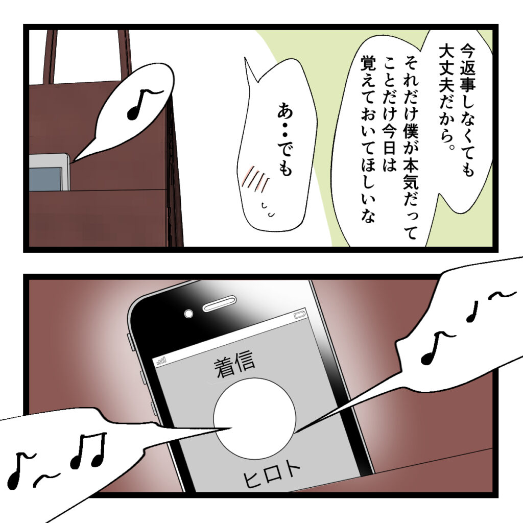 「今返事しなくても大丈夫だから。それだけ僕が本気だってことだけ今日は覚えておいてほしいな」と言われ、「あ・・でも」と上手く返事を返せずパニックの私。そのとき、私のカバンの中からスマホの着信音が聞こえてきました。