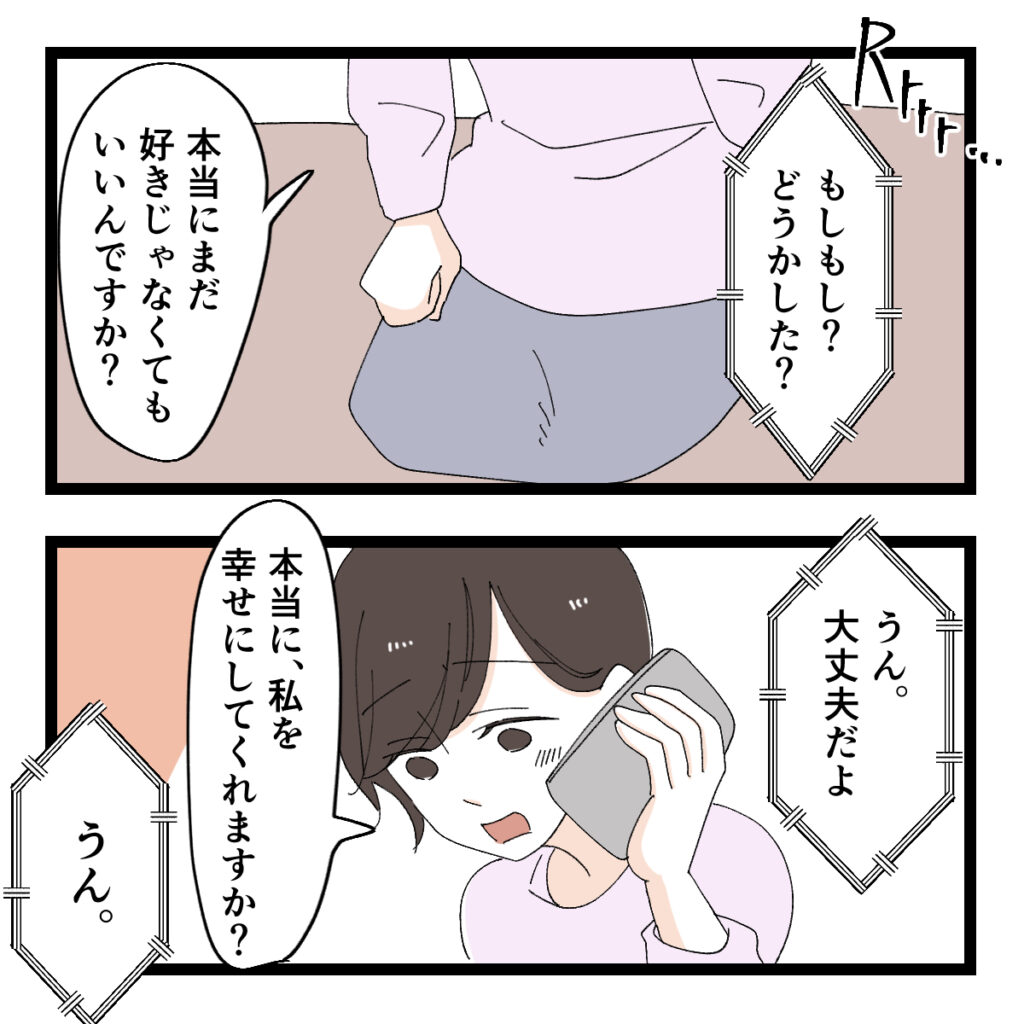 プルルルル。「もしもし?どうかした?」と電話に出るカイさんに、「本当にまだ好きじゃなくてもいいんですか?」とたずねる私。すると、「うん。大丈夫だよ」と答えるカイさんに、「本当に、私を幸せにしてくれますか?」と聞くと、「うん」と即答。