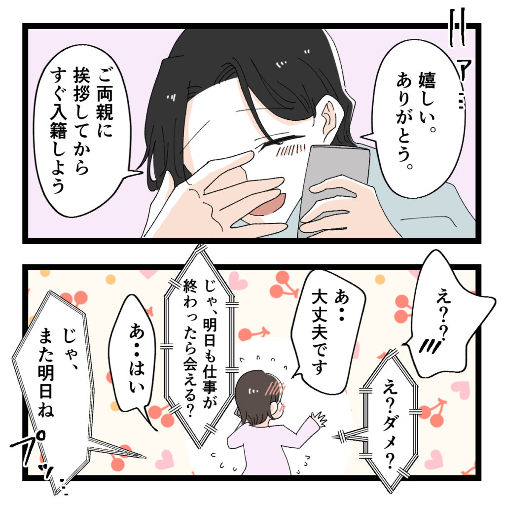 すると、「ハァ・・嬉しい。ありがとう。ご両親に挨拶してからすぐ入籍しよう」とカイさんに言われ、「え??」と驚くと、「え?ダメ?」とカイさんが。「あ・・大丈夫です」と返事をすると、「じゃ、明日も仕事が終わったら会える?」と聞かれ、返事をすると「じゃ、また明日ね」そう言って電話は切れてしまいました。