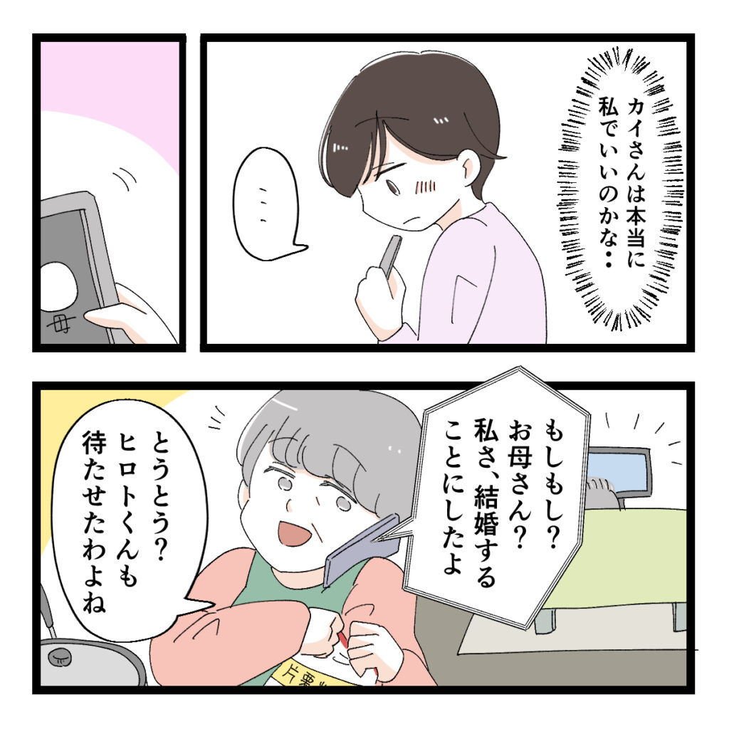電話を切った後、「カイさんは本当に私でいいのかな・・」と考え込んだ私は、お母さんに電話することに。