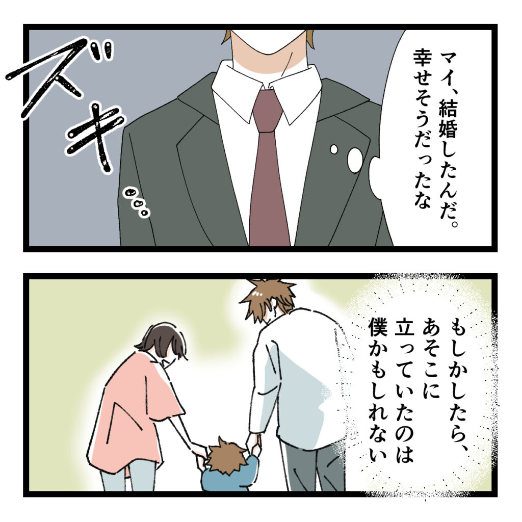 「マイ、結婚したんだ。幸せそうだったな」と思いながら、胸に走るズキっとした痛み。そして、「もしかしたら、あそこに立っていたのは僕かもしれない」と心の中で呟きました。