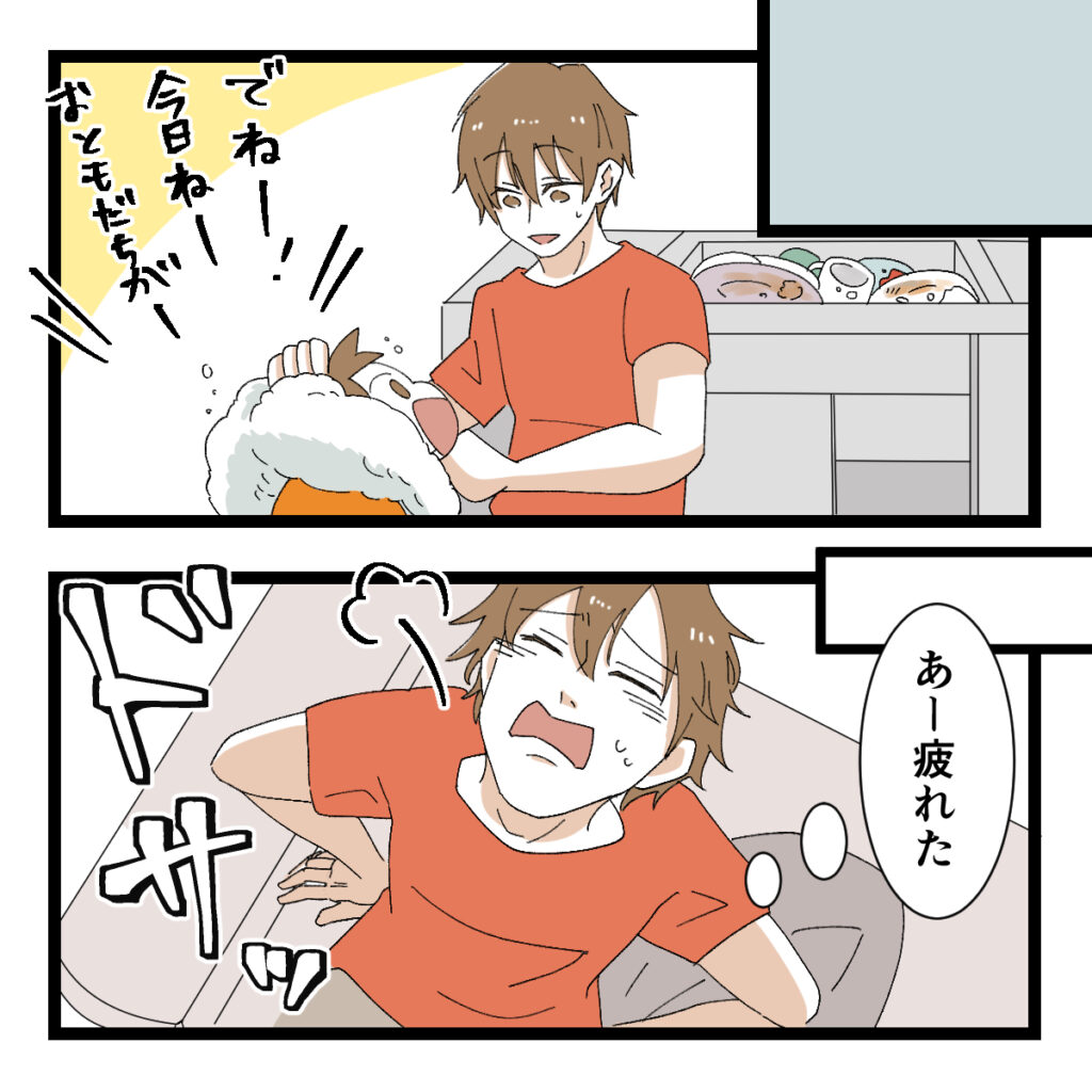 「でねー!今日ねー、おともだちがー」とお話が止まらないソウくんのお世話と家事に追われるヒロトさん。やっと一息つくころには「あー疲れた」と座り込んでしまいました。