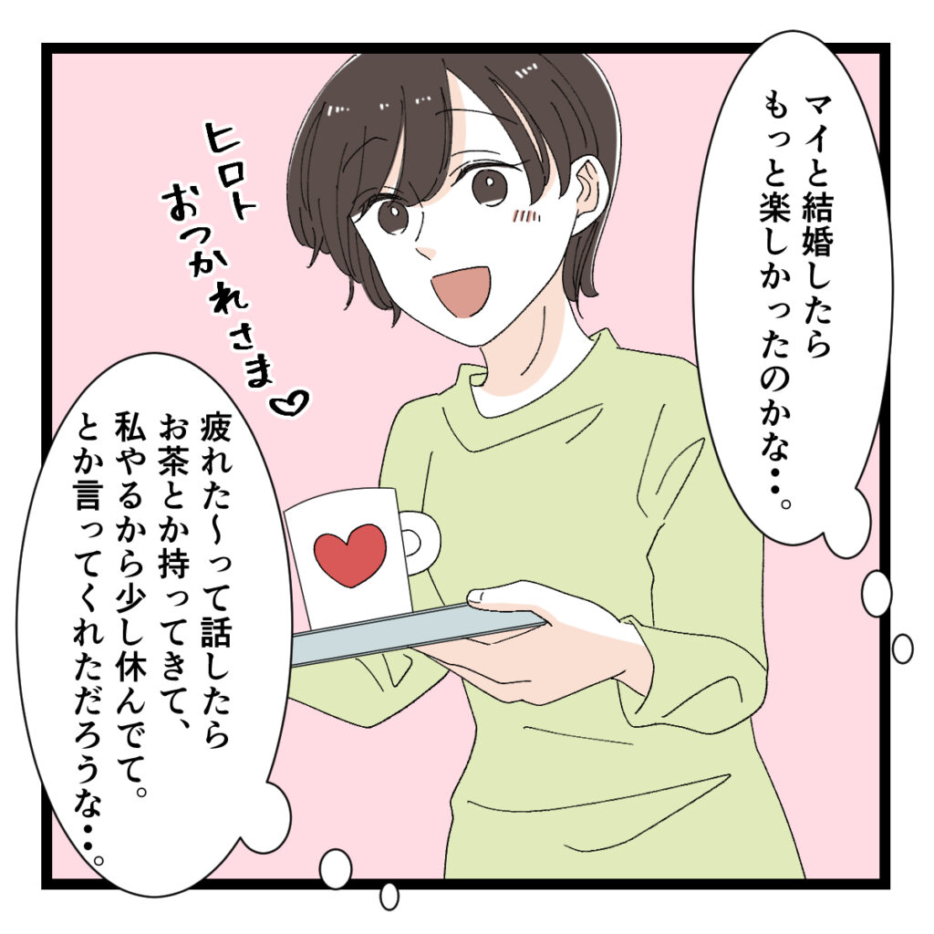 そしてまた、「マイと結婚したら、もっと楽しかったのかな・・。『ヒロト、おつかれさま』なんて、「疲れた~って話したら、お茶とか持ってきて、『私やるから少し休んでて。とか言ってくれただろうな・・」と妄想が止まりません。
