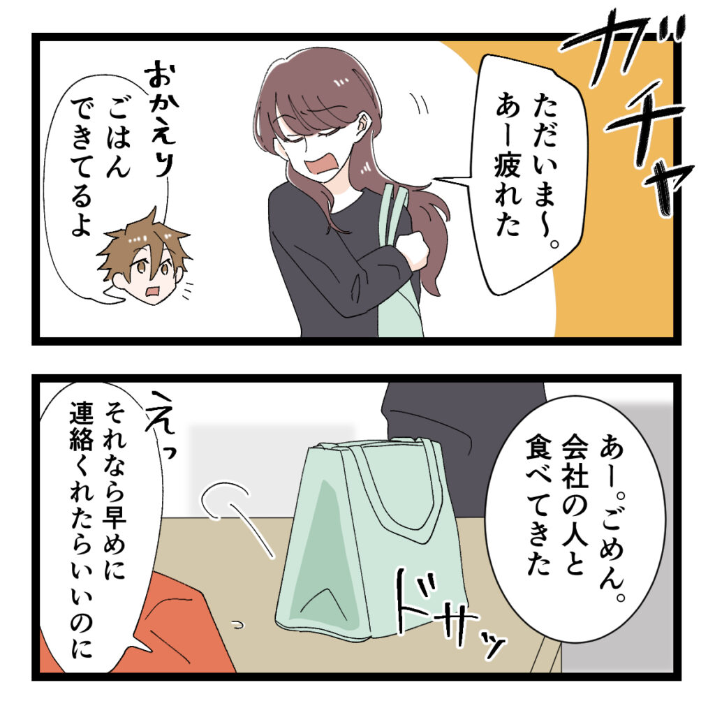 「ただいま~。あー疲れた」と帰って来たアユミさんに、「おかえり。ごはんできてるよ」とヒロトさんが言うと、「あー。ごめん。会社の人と食べてきた」と一言。「えっ、それなら早めに連絡くれたらいいのに」とヒロトさんが不満を言うと、