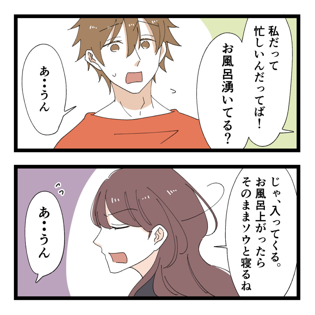 「私だって忙しいんだってば!お風呂湧いてる?」アユミさんの勢いに「あ・・うん」とヒロトさんが答えると、「じゃ、入ってくる。お風呂上がったら、そのままソウと寝るね」アユミさんにそう言われ、「あ・・うん」と答えるしかできませんでした。