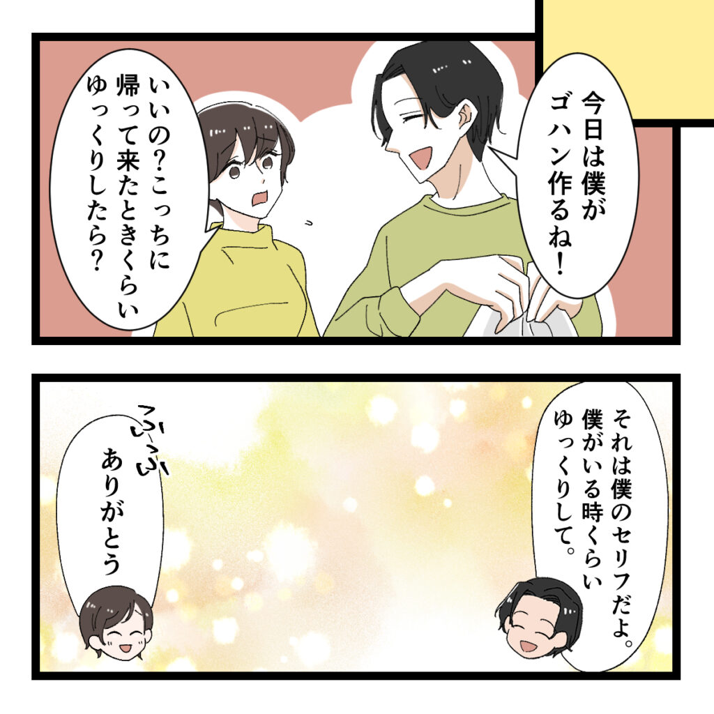 「今日は僕がゴハン作るね!」カイさんの言葉に、「いいの?こっちに帰って来たときくらいゆっくりしたら?」マイさんがそう言うと、「それは僕のセリフだよ。僕がいる時くらいゆっくりして」そう言われて「ふふ。ありがとう」とお礼を言いました。