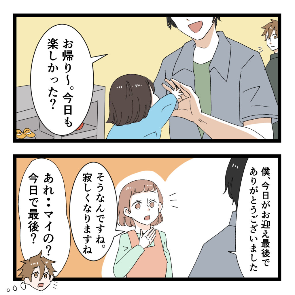「お帰り~。今日も楽しかった?」娘ちゃんに声をかけた後、「僕、今日がお迎え最後で。ありがとうございました」カイさんが先生にそう言うと、「そうなんですね。寂しくなりますね」と先生が言いました。