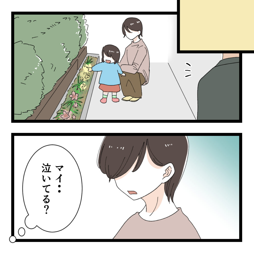 外で待っていたマイさんが娘ちゃんの遊びにつきあっているのを見て、「マイ・・泣いてる?」と思ったヒロトさんは、