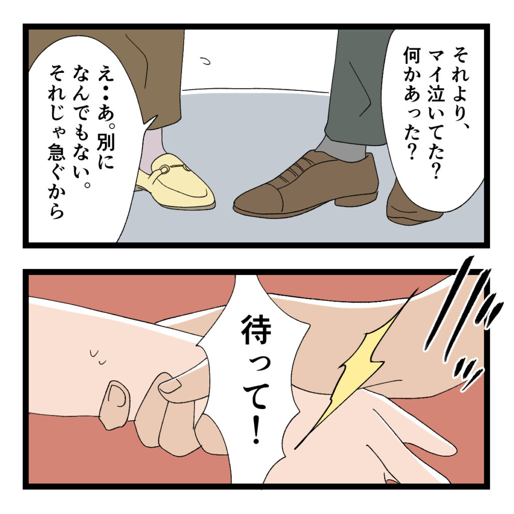 「それより、マイ泣いてた?何かあった?」と聞かれ、「え・・あ。別になんでもない。それじゃ急ぐから」と答えたマイさんが、その場を去ろうとすると、「待って!」そう言って、腕をグッと掴みました。