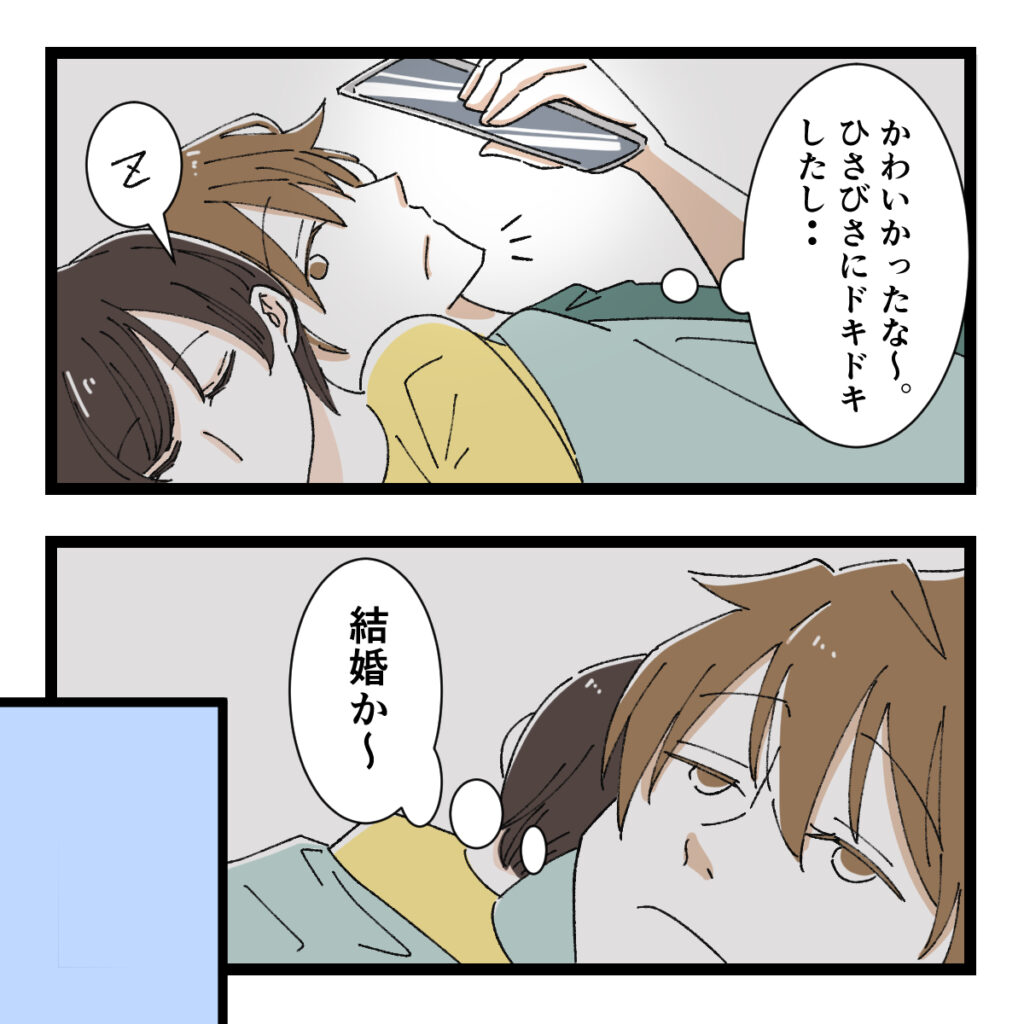隣で眠っているマイに気づかれないようにスマホを見ながら、(かわいかったな~。久々にドキドキしたし・・・)と思い返していました。チラリとマイを見て、もうドキドキなんてしないもんな、なんて考えてしまう。・・・結婚かぁ。すでに一緒に住んでいることも関係しているのか、結婚といわれてもピンとこないのが正直な気持ち。いやな訳じゃない。でも踏み切れない。