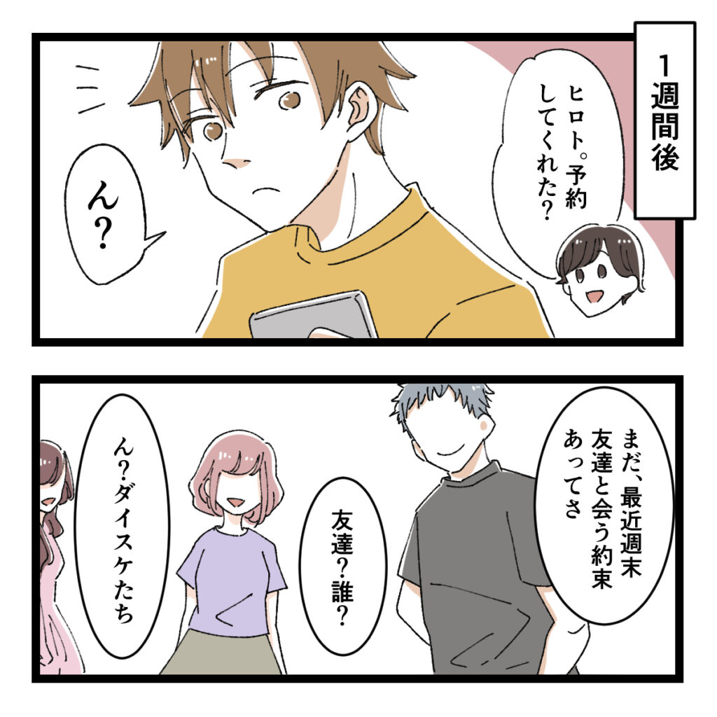 ヒロトが結婚式場の下見を予約すると言ってくれてから1週間経ちました。そろそろ予定伝えてくれてもいいのにと思いながら、『ヒロト。予約してくれた?』と聞いてみると、キョトンとした顔。そして「まだ、最近週末に友達と会う約束会ってさ。」と、いつもの返事。「友達?誰?」いつもならそんなこと聞かないけれど、つい聞いてしまいました。「ん?ダイスケたち。」とヒロトは答えました。ダイスケくんならどこに住んでいるのかもよく知っています。昔からヒロトと仲の良い友達で、ダイスケくんの彼女リサさんも顔見知りです。