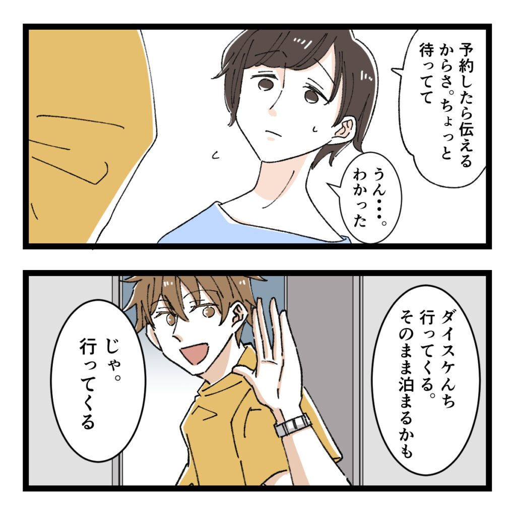 「予約したら伝えるから。ちょっと待ってて」と言うヒロトに、私は「うん。分かった」としか言えませんでした。そしてヒロトは今日も出かけるみたい。「ダイスケんち行ってくる。そのまま泊まるかも。」と言って、行ってしまいました。なんだか楽しそう。