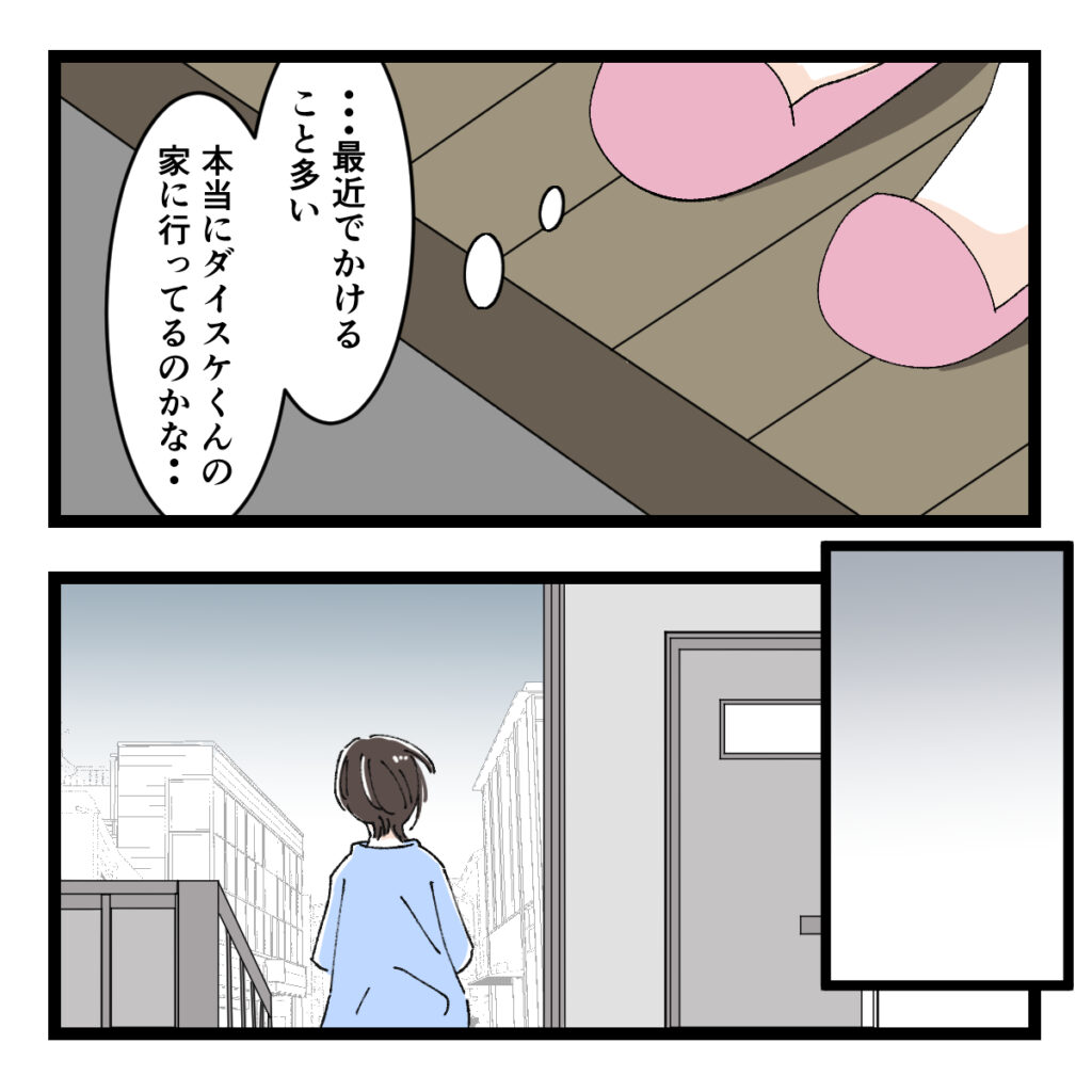 ヒロトは最近出かけることが多いな。そう思ったら、だんだん不安になってきました。「本当にダイスケくんの家に行ってるのかな。」一度思ってしまうと不安がどんどん増していきました。耐えられなくなって、私は外に飛び出しました。