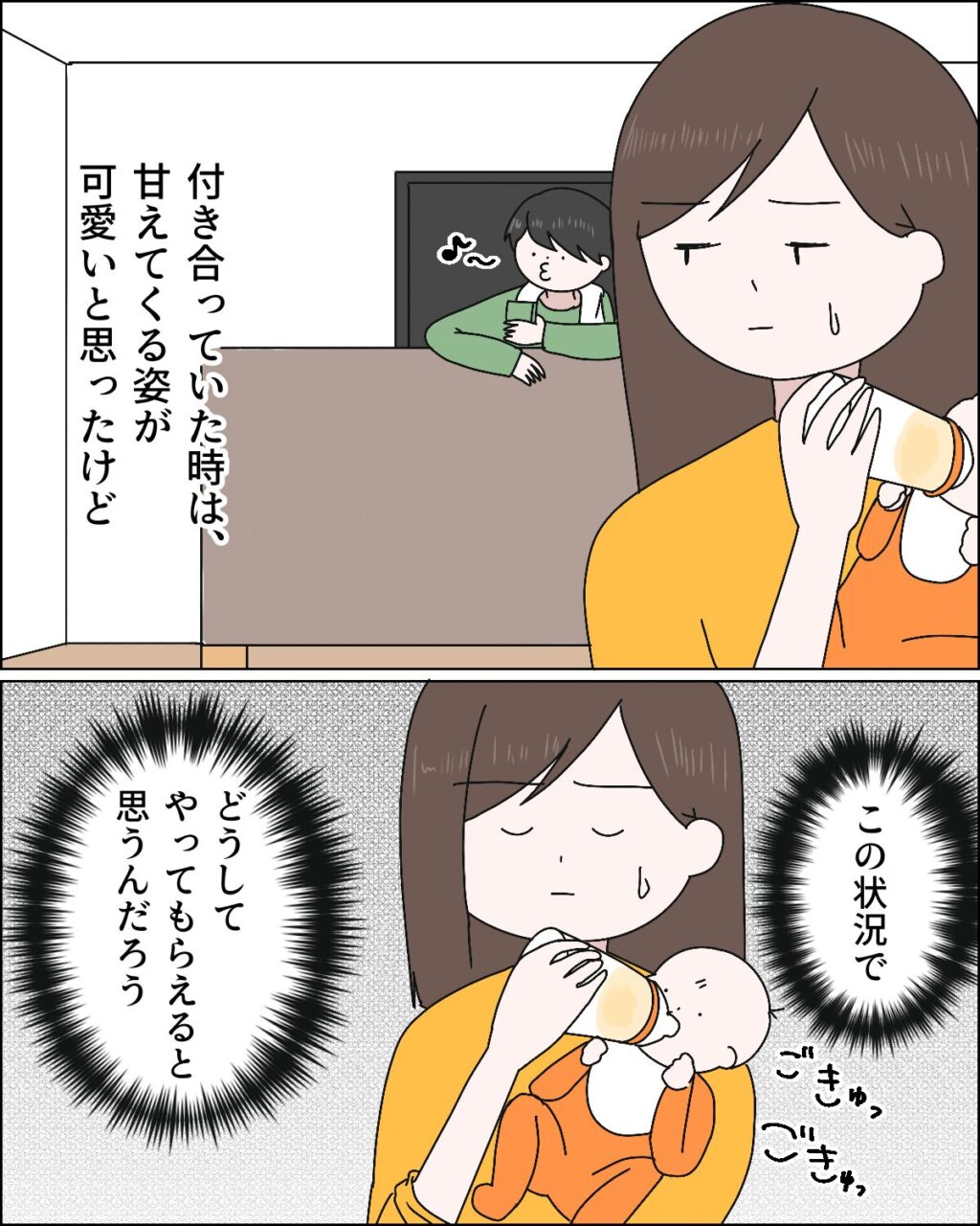 マサオは結婚して子どもができてからもずっとこんな調子です。付き合っていたときは甘えてくる姿がかわいいと思っていましたが、家族になり、この状況で、どうして未だに自分の世話をしてもらえると思うのか理解に苦しみます。